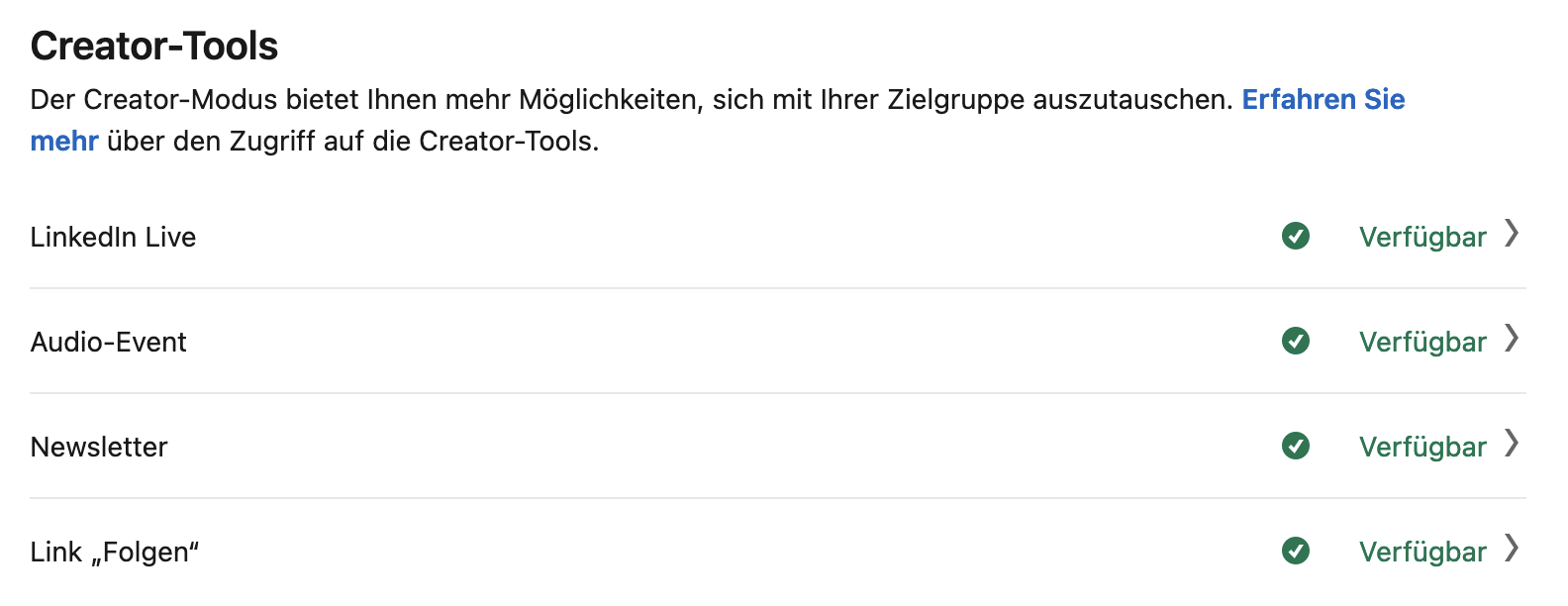 5) (Seit November 2021): Weitere Funktionen wie LinkedIn Live (Live Streaming) als auch Newsletter werden freigeschaltet. Vor allem beim Live Streaming könnte es sein, dass gewisse Voraussetzungen geprüft werden, ob man in der jüngeren Vergangenheit eigene Inhalte Content veröffentlicht hat oder ob man wiederholt gegen LinkedIns Nutzungsbedingungen verstoßen hat/ der Account bereits gesperrt worden ist. Hier sieht man, welche Funktionen aktiviert sind: