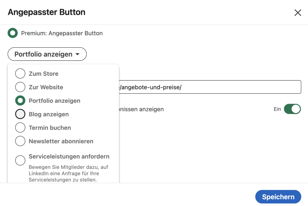 Welche Funktion habe ich gleich eingerichtet, als ich Premium freigeschaltet hatte? Den angepassten Button, welchen es erst seit 2023 auf LinkedIn gibt und durch welchen man mit einem Klick auf eine externe Webseite gelotst wird.