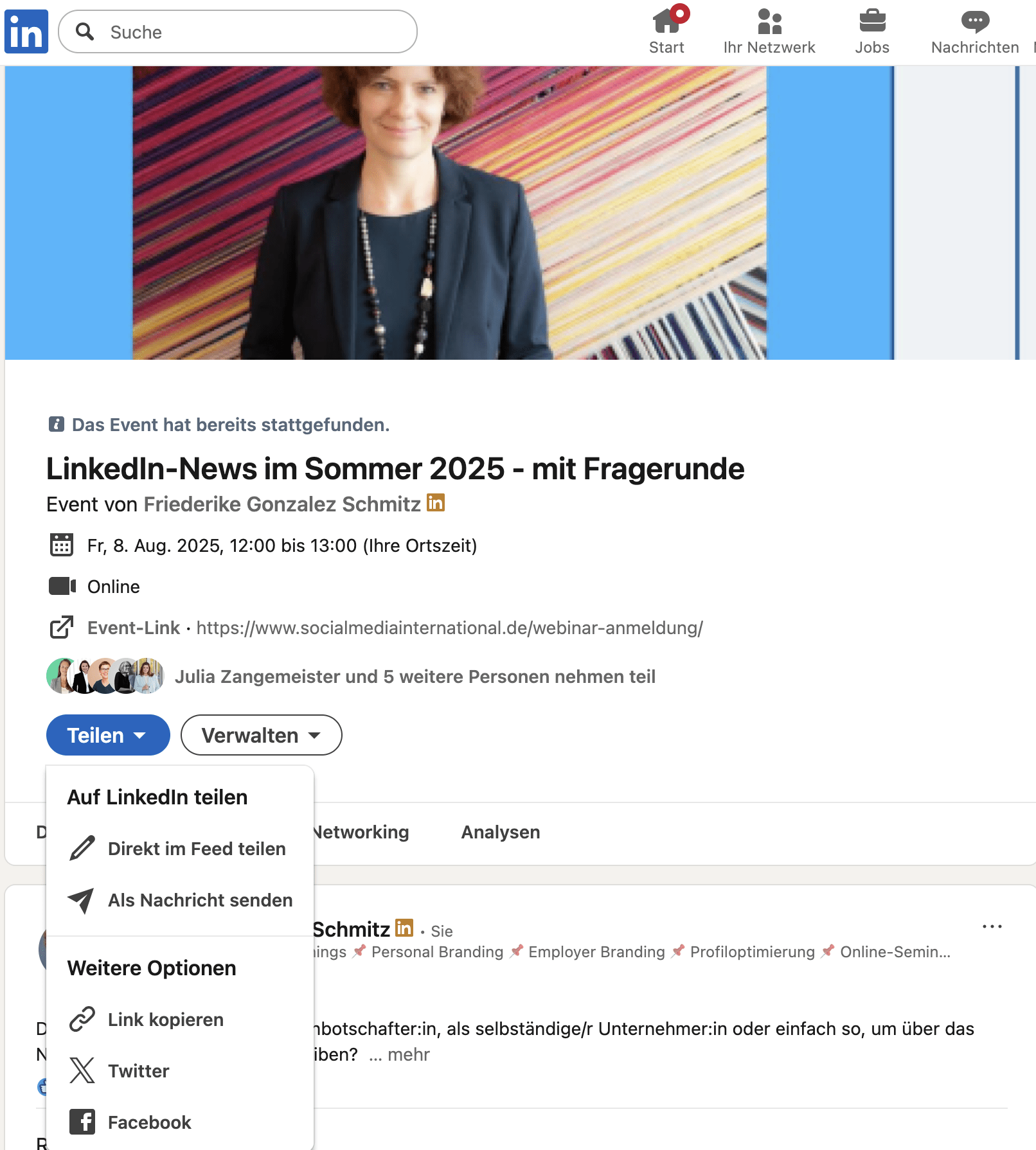 In diesem Artikel von 2019 habe ich u.a. erklärt, wie Ihr ein Event auf LinkedIn einstellen könnt. So in etwa kann das aussehen. Ihr seht, dass die Veranstaltung über unterschiedliche Wege geteilt werden kann. Auch auf X, auf Facebook oder über Nachrichten.