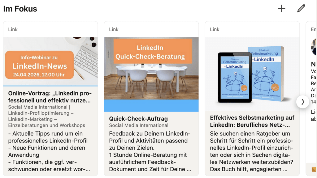 Damit Profilbesucher auf die Veranstaltung aufmerksam werden, kann ein Link zum Event zusammen mit einem Bannerbild in den Bereich „Im Fokus“ gestellt werden. Neben neuen Profilbesuchenden erreicht man damit auch bestehende Kontakte.